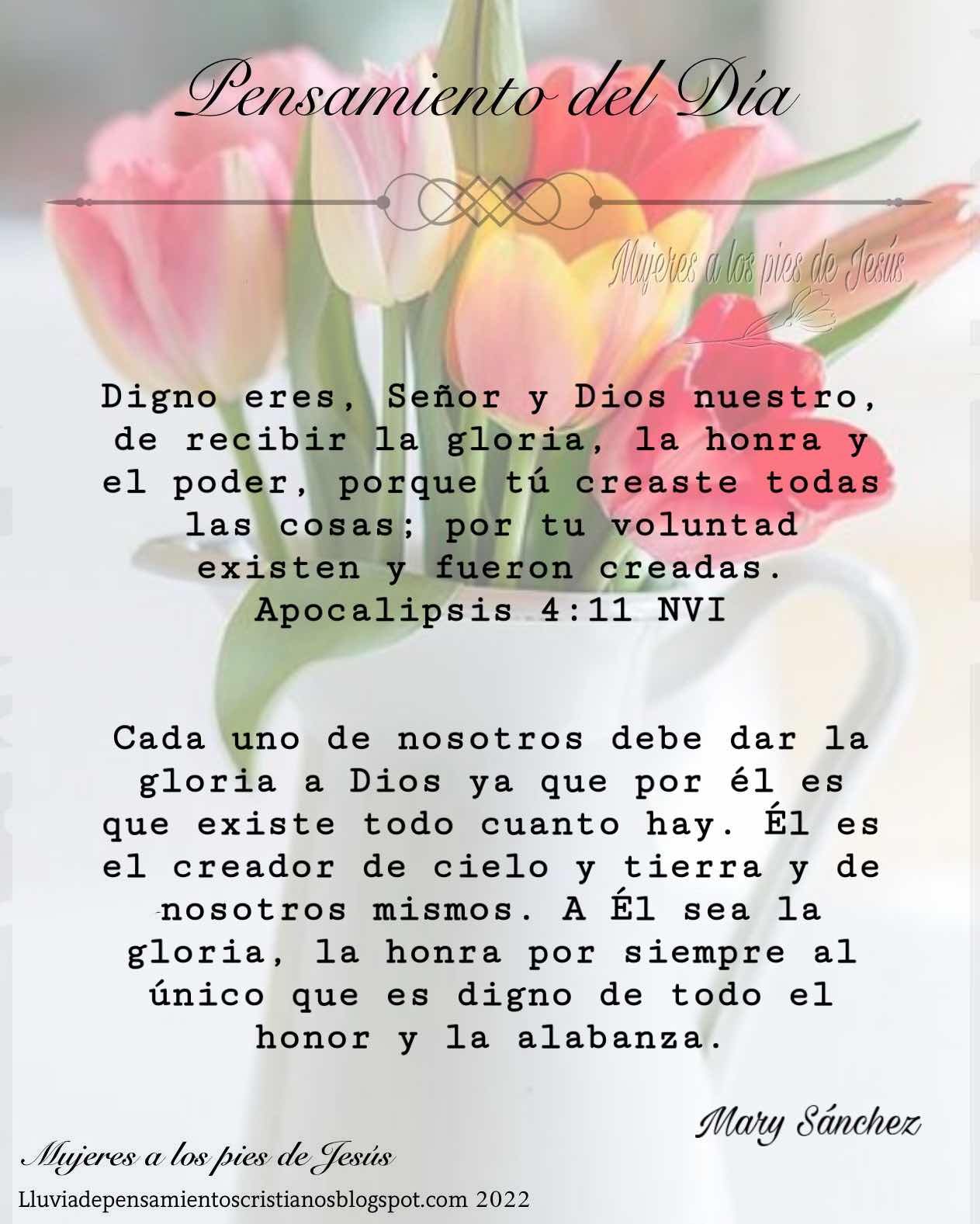 Cada uno de nosotros debe dar la gloria a Dios ya que por él es que existe todo cuanto hay. Él es el creador de cielo y tierra y de nosotros mismos. A Él sea la gloria, la honra por siempre al único que es digno de todo el honor y la alabanza.