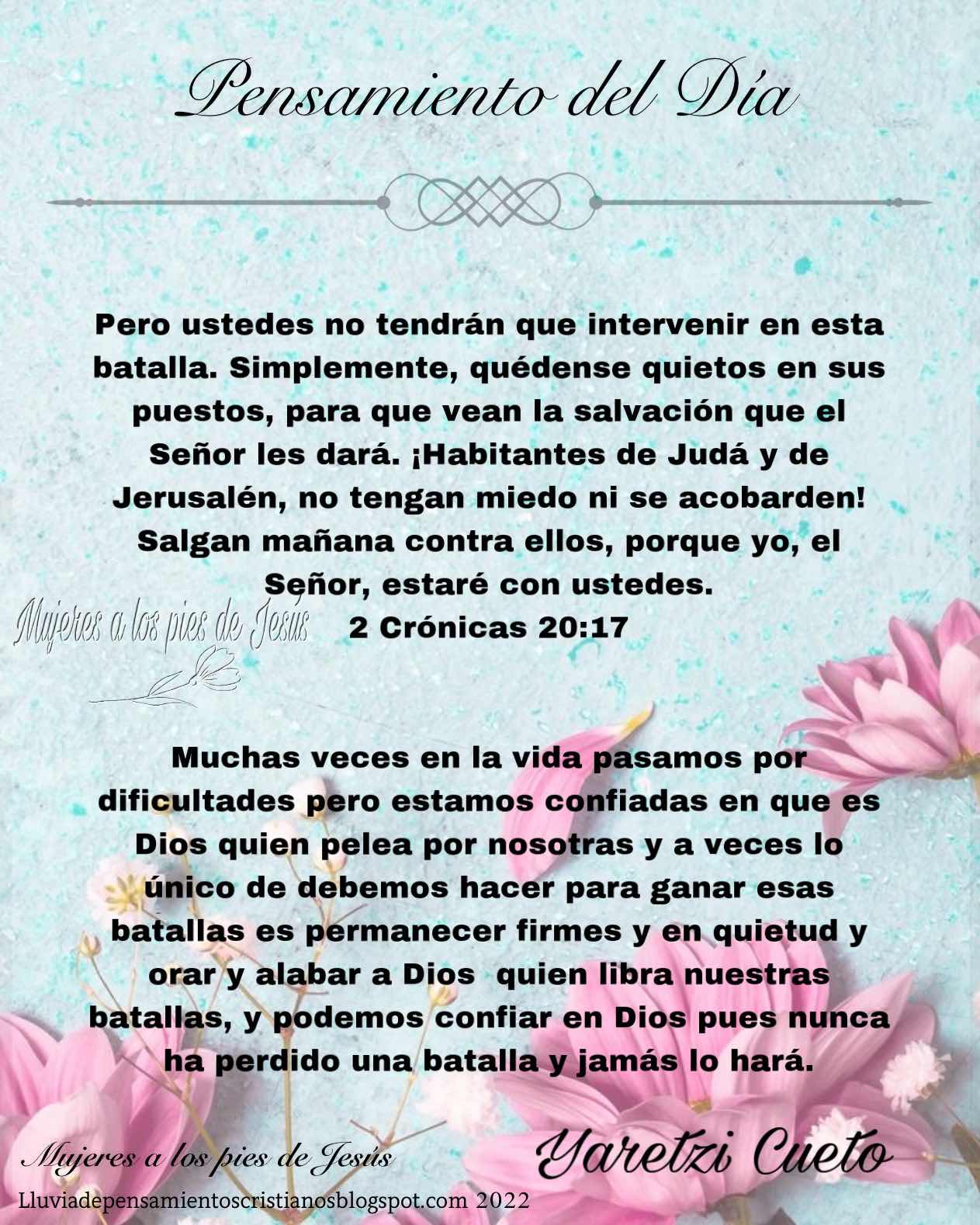 Muchas veces en la vida pasamos por dificultades pero estamos confiadas en que es Dios quien pelea por nosotras y a veces lo único de debemos hacer para ganar esas batallas es permanecer firmes y en quietud y orar y alabar a Dios quien libra nuestras batallas, y podemos confiar en Dios pues nunca ha perdido una batalla y jamás lo hará.
