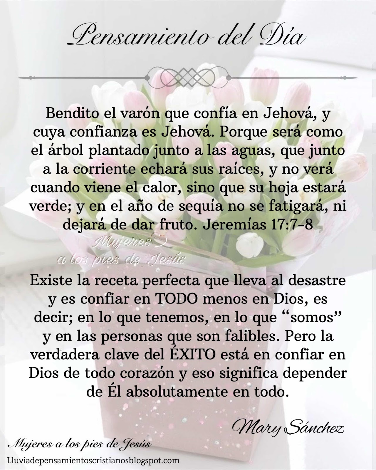 Bendito el varón que confía en Jehová, y cuya confianza es Jehová. Porque será como el árbol plantado junto a las aguas, que junto a la corriente echará sus raíces, y no verá cuando viene el calor, sino que su hoja estará verde; y en el año de sequía no se fatigará, ni dejará de dar fruto. Jeremías 17:7-8