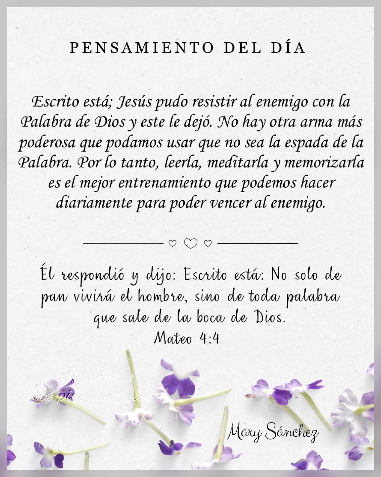 Escrito está; Jesús pudo resistir al enemigo con la Palabra de Dios y este le dejó. No hay otra arma más poderosa que podamos usar que no sea la espada de la Palabra. Por lo tanto, leerla, meditarla y memorizarla es el mejor entrenamiento que podemos hacer diariamente para poder vencer al enemigo.