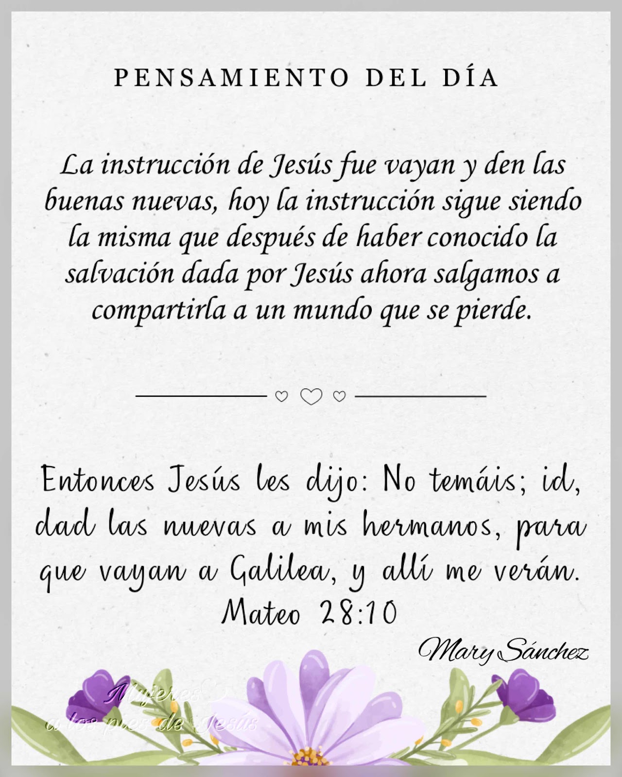 La instrucción de Jesús fue vayan y den las buenas nuevas, hoy la instrucción sigue siendo la misma que después de haber conocido la salvación dada por Jesús ahora salgamos a compartirla a un mundo que se pierde.